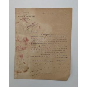 adressée à un philanthrope annonçant la representation de gala au benefice de la Société. Paris, le 12 mai 1908, 1 p. tapuscrite et signée des Président [Paul Ferrier] et secrétaires de la Commission.