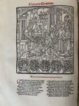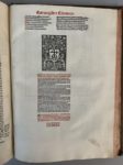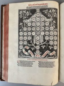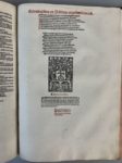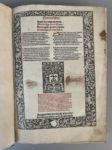 Impression soignée en rouge et noir sur 2 colonnes, avec initiales gravées sur bois ; première page de titre ornée d'une bordure décorative gravée sur bois, et portant la marque du libraire qui figure également sur les 3 autres titres. Un grand bois gravé est répété au v° de 3 pages de titre, et une grande figure de l'Arbor consanguinitatis gravée sur bois à pleine page.