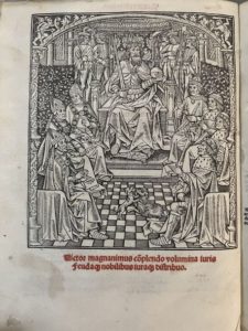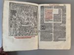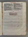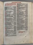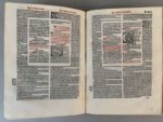 Edition composée d'extraits du Corpus de droit civil, avec les commentaires d'Accursius, établie par le libraire André Bocard, qui en a partagé l'édition avec ses confrères Kerver, Bonhomme et Petit. Caractères gothiques, sur 2 colonnes encadrées des commentaires, impression en rouge et noir, initiales gravées sur bois ; vignette gravée sur bois à pleine page en regard du folio I.