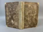 Initiales peintes en rouge à l'époque sur lettres d'attente typographiées, petites capitales rehaussées en jaune en début de volume. Grand de marges (h=258 à 260 mm).