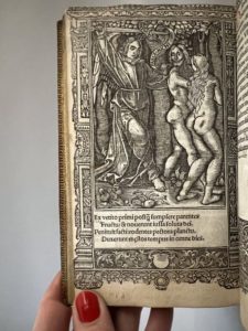 L'illustration entièrement gravée sur bois se compose ici de 39 vignettes à pleine page, et de figures encadrant chaque page, dont l'iconographie de la danse macabre qui s'ouvre sur une vignette à pleine page f° I3 v° et se développe dans les marges jusqu'au f° M1 r°.