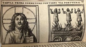 Ouvrage illustré de 50 planches gravées sur cuivre (qq. défauts de numérotation), un frontispice gravé, et un plan dépliant, et de très nombreuses figures gravées sur bois dans le texte. C'est l'abrégé de la traduction latine du célèbre ouvrage de Bosio, enrichie de notes par P. Aringhi. (Graesse I, 196).