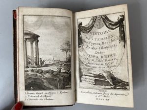 BALLET (François). Histoire des temples des Payens, des Juifs et des Chrétiens. A Paris, chez Cailleau, 1760. In-12, XII p. (dont le titre gravé), [1] f. (approb.), 455 p., veau havane moucheté époque, dos lisse et orné, pièce de titre maroquin grenat, tranches rouges (défauts dont coiffe de tête usée, piq. de vers aux mors).