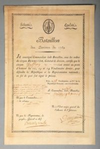 Document exceptionnel de cette époque. Ce certificat du Bataillon des Patriotes de 1789, fut donné au Citoyen « Geoffroy » qui fut en poste les 12, 13 et 14 vendémiaire, lors de l'insurrection royaliste.