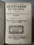 On joint : [SARASIN (Jean) ; LECT (Jacques)]. Le citadin de Geneve. Ou Response au Cavalier de Savoye. Se vendent à Paris, chez P. Le Bret, 1606. In-8, [4] f., 383 p., [8] f. (le dernier blanc), velin époque à recouvrements, dos lisse et muet, traces de lacets (texte et reliure lavés, gardes renouvelées, mouillures étendues mais atténuées).