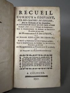 [CARRÉ (Rémi)]. Recueil curieux & édifiant, sur les cloches de l'Église, avec les cérémonies de leur bénédiction. A l'occasion de celle qui fut faite a Paris le jeudi 3 juin 1756. à l'abbaye de Penthemont, sous le gouvernement de madame de Bethisy ; en présence & aux noms de monseigneur le dauphin, et de madame Adelaïde de France ; et le mardi 14 septembre suivant à l'Abbaye au bois, sous le gouvernement de madame de Mornai, en présence & aux noms de monseigneur le prince de Condé, et de madame la princesse son é pouse. A Cologne, s.n., [i.e. Paris, Vve de J.-B. Lamesle], 1757. In-12, [2] f., 104 p., basane havane époque, dos lisse et orné, pièce de titre brune, tranches jaspées (coins et coiffes usés, mors fendillés, qq. rouss.).