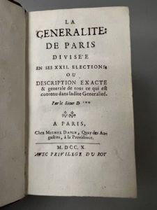 [CHALIBERT-DANGOSSE (J.)]. La généralité de Paris divisée en ses XXII élections ou description exacte & générale A Paris, chez David, 1710. In-12, [12] f. (le premier blanc), 522 p., [3] f. (catalogue éditeur), veau havane époque, dos à 5 nerfs, pièce de titre fauve, caissons ornés, tranches marbrées, un coin restauré.