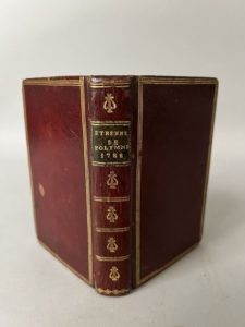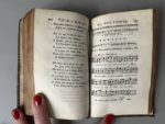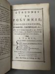 [Chansons]. ÉTRENNES DE POLYMNIE. Choix de chansons, romances, vaudevilles, &c. Avec de la musique nouvelle A Paris, chez Bélin, Brunet, Desenne, 1788. In-18, [8] f., 308 p., musique notée, maroquin grenat époque, dos lisse, pièce de titre maroquin olive, filets et lyres en fleurons dorés, triple filet doré bordant les plats, roulette dorée aux coupes et chasses, tranches dorées (3 coins ém., rouss. modérées, annot. anciennes au fx-titre).