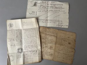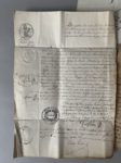 - 2 actes de décès : Joseph Moras, le 1er germinal de l'an 7 républicain + Charlotte Emilie Lambert, veuve Moras, le 30 germinal, an 11 de la république. Cachets de la mairie de Montmorency, du tribunal de Pontoise et timbre royal à sec répété. 1 f. in-4 remplié de 4 p. + 1 f. in-4, les deux sur papier vergé. Documents adressés par voie postale à un notaire de Montmorency le 8 novembre.