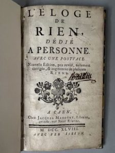 On joint : [COQUELET (Louis)]. L'éloge de rien, dédié à personne. Avec une postface. Caen, 1748. In-12, 43 p., cartonnage marbré à la Bradel, pièce de titre grenat [Atelier Laurenchet] (titre remonté et un peu défraîchi, dernier f. lég. bruni).