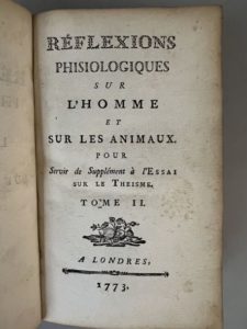 Edition originale du premier ouvrage de l'auteur, publié à Neuchâtel sous la fausse adresse de Londres. C.-E. de Ferrières (1741-1804), originaire de Poitiers, fut député de la noblesse au États-Généraux. Le tome II a pour titre : « Réflexions phisiologiques sur l'homme et sur les animaux. Pour servir de supplément à l'Essai sur le theisme ».