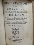 FORMEY (Johann Heinrich Samuel). Systesme du vrai bonheur. [Relié à la suite] : Essai sur la perfection, pour servir de suite au Systesme du vrai bonheur. [Et] : Dissertation sur les raisons d'établir ou d'abroger les loix. A Utrecht, chez Sorli, 1751. Trois ouvrages en 1 vol. in-12, 94-90-130 p., veau havane moucheté époque, dos à 5 nerfs, pièce de titre veau grenat, caissons ornés, tranches jaspées (coiffes et coins frottés, mouillures claires dans les marges latérales).