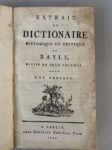 Edition originale de cette sélection d'articles du dictionnaire de Pierre Bayle, réalisée par le marquis d'Argens, et Frédéric II de Prusse, celui-ci étant également l'auteur de la préface. Le choix des articles révèle les intentions des auteurs, qui n'ont sélectionné que des notices sur des philosophes antiques et modernes, tels Aristote, Épicure, Spinoza et même Savonarole.