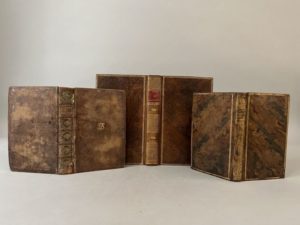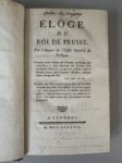 3. [GUIBERT (J.-A.-H. de)]. Eloge du roi de Prusse [Frédéric II], par l'auteur de l'Essai général de tactique. A Londres, s.n., 1787. In-8, 304 p., basane racinée début XIXe s., dos lisse orné, pièce de titre rouge, roulette dorée bordant les plats, filet doré aux coupes, tranches jaunes (un coin frotté, mors fendillés en tête). On trouve, relié à la suite : - CHÉNIER (J.). Discours sur les progrès des connaissances en Europe [Paris], Impr. Didot jeune, an IX, [2] f., 52 p. [Et] : - MORELLET. Éloge de Marmontel Paris, Xhrouet, An XIII - 1805, [1] f., 41 p. Provenance : Léon de Vigny (sign. anc. biffée au titre).