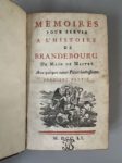 1. [FREDERIC II]. Mémoires pour servir à l'histoire de Brandebourg. De main de maître. Avec quelques autres pièces S.l., s.n., 1751. Deux parties en 1 vol. in-8, [3] f., 162 p., (1] f., 167 p., veau brun époque, dos à 5 nerfs, pièce de titre, tranches rouges (défauts dont dos usé recollé, mors sup. fendu ; rousseurs). Nouvelle édition parue un an après l'originale. Provenance : initiales JPS frappées au plat sup. et estampillées au titre.