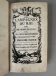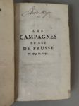 2. [STILLE (Christoph Ludwig von)]. Les campagnes du roi [de Prusse], avec des réflexions sur les causes des évènemens. S.l., s.n., 1762. Deux parties en 1 vol. in-12, [4] f. (dont le titre gravé dans un encadrement par P. La Bonté), 228 p. en continu, veau veiné époque, dos lisse orné à la grotesque, pièce de titre brune, triple filet doré bordant les plats, filet doré aux coupes, tranches dorées (défauts dont coins et coiffe de queue émoussés, piq. de ver sur un mors, mouill. très claire au début du texte). La seconde partie commence p.141 par une page de titre particulière portant « Les campagnes du roi de Prusse en 1745 ». 2 vignettes gravées collées à la fin de l'avertissement et à la fin du vol. Provenance : Silhouet major (sign. ancienne) ; C. de Stadian (étiq. armoriée gravée ).