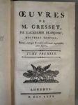 GRESSET (J.-B.-L.). OEuvres Nouvelle édition revue, corrigée avec figures. Londres, s.n., 1780. 2 vol. in-8, XVI-292 p. + [2] f., 309 p., pl., veau écaille époque, dos lisse orné, pièces de titre et de tomaison olive, triple filet doré bordant les plats, filet doré aux coupes, roulette intérieure, tranches marbrées (dos passés, menus défauts dont accroc à une coiffe ; bruniss. en marge des tout premiers et tout derniers f.).