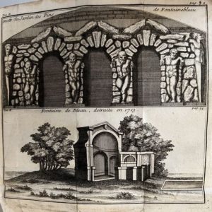 GUILBERT (Pierre). Description historique des château, bourg et forest de Fontainebleau, contenant une explication historique des peintures, tableaux, reliefs, statuës, ornemens qui s'y voyent A Paris, chez A. Cailleau, 1731. Deux tomes en 1 fort vol. in-12, [6] f., LXIX p., [1] f., 242 p., [3] f. (approb., errata), [8] f., 309 p., pl., velin ivoire époque, dos lisse (taches brunes aux coupes et bords des plats, mouillure sur toutes les marges de tête, petits trous et saliss. en marge des 1ers f., lacunes au plan au niveau du pli central).
