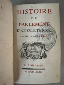 On joint : - RAYNAL (Guillaume-Thomas). Histoire du Parlement d'Angleterre. A Londres, s.n., 1749. In-8, 367 p., veau havane moucheté époque, dos à 5 nerfs, pièce de titre marron, caissons ornés, roulette dorée aux coupes, tranches rouges (qq. frott. dont aux coins).