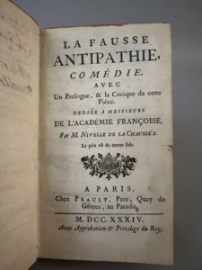 LA CHAUSSÉE (Pierre-Claude). La fausse antipathie, comédie. Avec un prologue, & la critique de cette pièce par M. Nivelle de La Chaussée. A Paris, chez Prault, 1734. In-12, [3] f., 122 p., veau havane moucheté époque, dos à 5 nerfs, pièce de titre maroquin grenat, caissons ornés, roulette dorée aux coupes, tranches rouges (menus défauts dont accroc le long d'un caisson au plat inf.