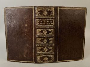 LARROQUE (Matthieu de). Histoire de l'eucharistie, divisée en trois parties, dont la première traitte de la forme de la célébration, la seconde de la doctrine, et la troisième du culte. A Amsterdam, chez D. Elsevier, 1671. In-12,[12] f., 900 p., [6] f., maroquin brun époque, dos à 5 nerfs, titre doré, caissons ornés, double filet doré bordant les plats, tranches mouchetées (qq. rouss. modérées).