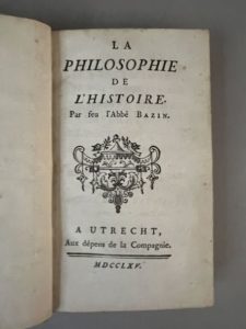On joint : - [VOLTAIRE]. La philosophie de l'histoire. Par feu l'abbé Bazin. A Utrecht, aux dépens de la Compagnie, 1765. In-12, VII-276 p., veau fauve marbré époque, dos lisse orné, pièce de titre maroquin grenat, filet doré aux coupes, tranches rouges (frott. négligables, rousseurs).