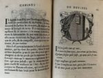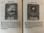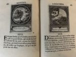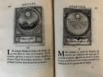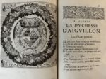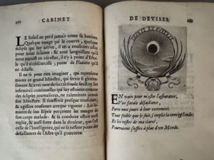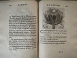 Édition originale. L'illustration se compose de 122 figures emblématiques gravées sur cuivre : 65 figures pour Le Cabinet des devises (les 2 premières devises ne sont pas illustrées), grande composition aux armes de la duchesse d'Aiguillon gravée par Laloüette pour Le Jardin de devises, 57 figures pour Les Devises adoptées. Les 20 devises du Jardin et les 14 devises royales ne sont pas illustrées ; ainsi que d'un frontispice dessiné et gravé par Le Paultre, une vignette de titre à la marque et aux armes des Cramoisy, un bandeau gravé sur bois répété.