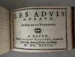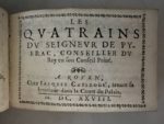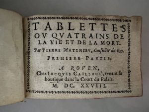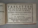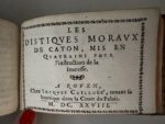 1. Tablettes ou quatrains de la vie et de la mort, par Pierre Matthieu, conseiller du roy (3 parties) - 2. Les quatrains du seingeur de Pybrac - 2. Les advis moraux du soeur de La Valbonne. - 4. Les distiques moraux de Caton, mis en quatrains pour l'instruction de la jeunesse.