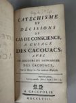 [MOREAU (Jacob-Nicolas)]. Nouveau mémoire pour servir à l'histoire des Cacouacs. Amsterdam, s.n., 1757. [2] f., 108 p. - [Relié à la suite] : [GIRY DE SAINT-CYR (J.). Catéchisme et décisions de cas de conscience, à l'usage des Cacouacs, avec un Discours du patriarche des Cacouacs, pour la réception d'un nouveau disciple. A Cacopolis, 1758. XLII-107 p. - [Et] : [PALISSOT DE MONTENOY (Charles)]. Petites Lettres sur de grands philosophes. A Paris, s. n., 1757. [1] f., IV, 101 p. Trois ouvrages en 1 vol. in-12, veau havane marbré époque, dos à 5 nerfs, pièce de titre mar. grenat, caissons ornés, triple filet doré aux plats, tranches rouges, coins et coiffes gross. restaurés (frottements ; brunissures, petite mouill. sporadique en marge).