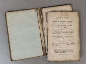 [MOREL (Jean-Marie)]. Tableau de l'école de botanique du Jardin des Plantes de Paris, ou Catalogue général des plantes qui y sont cultivées et rangées par classes, ordres, genres et espèces, d'après les principes de la Méthode naturelle de A.L. Jussieu. Suivi d'une Table alphabétique des noms vulgaires des plantes les plus fréquemment employées en médecine, dans les arts, la décoration des jardins, etc. ; avec les noms des genres et des espèces auxquels elles se rapportent. A Paris, chez Didot le Jeune, Fuchs, An VIII-1800. In-8, [2] f., 107 p., demi-velin post., titre manuscrit en long, toutes marges conservées (accroc en tête du dos, déboîté, coins usés).