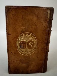 [Reliure aux armes]. NADAL (Augustin). Histoire des vestales avec un Traité du luxe des dames romaines. A Paris, chez la Vve de P. Ribou, 1725. In-12, [12] f., 386 p., [3] f., veau fauve glacé époque, dos à 5 nerfs, pièce de titre maroquin grenat, caissons ornés, armes frappées au centre des plats bordés d'un triple filet doré, roulette dorée aux coupes et chasses, tranches dorées, restaurations habiles (taches aux plats, rouss. et bruniss.).