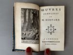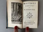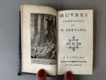 - BERNARD (Pierre-Joseph). OEuvres complètes. A Londres [i.e. Lyon], s.n., 1777. In-24, [2] f., 204 p., front. gravé sur cuivre, maroquin rouge époque, dos lisse orné, pièce de titre noir, triple filet doré bordant les plats, filet doré aux coupes, roulette intérieure, tranches dorées (coins et coiffe de tête émoussés). De la collection des petits formats lyonnais précurseurs de Cazin. Provenance : André Le Caron de Fleury, 1863-1946 (ex-libris armorié gravé).