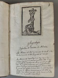 Cours de médecine composé de deux volumes, l'un en français, paginé de 5 à 301 ; l'autre en latin, paginé de 3 à 473 (absence de pages de titre sans défaut visible). Ecriture soignée, à l'encre, au r° et v°. Une vignette gravée sur bois à sujet religieux collée en tête du texte en français. Signature manuscrite en marge d'un premier feuillet : « Turgot de Montinon (?) ».