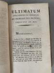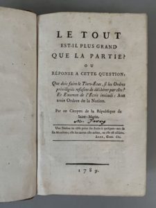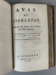 1. TOUT (LE) est-il plus grand que la partie ? ou Que doit faire le Tiers Etat si les ordres privilégiés refusent de délibérer par tête ?... par un Citoyen de la République de Saint-Marin. S.l., s.n., 1789. [2] f., 40 p. - 2. [LE TELLIER ?]. La première aux grands. S.l., s.n., v. 1789. 43 p. - 3. ULTIMATUM d'un citoyen du Tiers-État au Mémoire des princes, présenté au roi. Seconde édition ; suivie du Fin mot d'un Marseillois. S.l., s.n., 1789. [1] f., 74 p., [1] f. (titre bruni, saliss. en marge de la dernière p.). - 4. [SERVAN (J.-M.-A.)]. Commentaire roturier, sur le noble Discours adressé à monseigneur le prince de Conti, à Monsieur, frère du roi, dans l'assemblée des notables, le 1788. A Paris, & se distribue gratis à l'Hôtel de Conti, 1789. 32 p. - 5. [MORELLET (André)]. Projet de réponse à un écrit répandu sous le titre de Mémoire des princes. S.l., s.n., [1788]. 51 p. - 6. SERVAN (J.-M.-A.). Adresse aux amis de la paix. S.l., s.n., 1789. 80 p. - 7. [RABAUT SAINT-ÉTIENNE]. Considérations sur les intérêts du Tiers-État, adressées au peuple des provinces, par un propriétaire foncier. S.l., s.n., 1788. 107. - 8. [BAUVEAU (C.-L.-V. de)]. Avis au Tiers-État, suivi de trois Lettres sur la forme des États-Généraux. A Londres, s.n., 1788. [1] f., 77 p. - 9. PLAINTES, Doléances, remontrances et voeu de N. Bourgeois de Paris. S.l., s.n., [1789]. 77 p. - 10. [BERGASSE (Nicolas)]. Observations sur le préjugé de la noblesse héréditaire. Londres, s.n., 1789. VI-62 p.