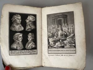 - CHANSONNIER (LE) de la Montagne ou Recueil de chansons, vaudevilles... et hymnes patriotiques par différens auteurs. Troisième édition augmentée A Paris, chez Favre, l'an 2 [1793]. In-18, IV-176 p., fr., broché, couv. ancienne marbrée, étiq. de titre ms. au dos (qq. rouss. mq. marg. en coin du dernier f.). Illustré d'un frontispice avec 4 portraits et d'un titre allégorique, le tout gravé sur cuivre.