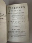 - ÉTRENNES lyriques, anacréontiques. A Paris, chez le libraire du Théâtre du Vaudeville, l'an deuxième de la République, ère vulgaire 1794. in-12, [6] f., 240 p., pl., veau havane moucheté époque, dos lisse orné, pièce de titre fauve, roulette dorée aux coupes, tranches rouges (2 coins frottés). Illustré d'un planche allégorique gravée sur cuivre par Ponce d'après Monnet.