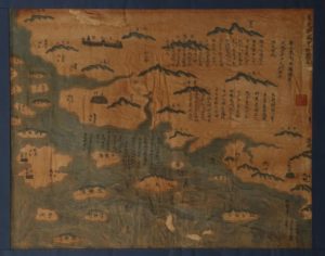 Carte géographique de la ville Dongguan dans la province de Guangdong, encre et couleurs sur papier, illustrant des montagnes, îles et ports, avec des inscriptions qui raconte des batailles navales historiques.