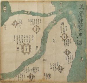 Carte géographique de la ville de Shanghai, encre et couleurs sur papier, illustrant des arrondissements, rivières, lac et mer.