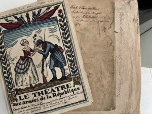 Objet de souvenir conservé dans une chemise moderne illustrée d'une composition en couleurs de Guy Arnoux (avec le titre « Le théâtre aux armées de la République », et le texte de La Marseillaise) ; elle-même dans une enveloppe en toile à l'en-tête du Crédit Lyonnais et adressée en 1922 au Crédit Lyonnais de Clermont Ferrand, avec cachets de cire rouge.