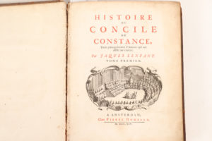 LENFANT (Jaques) sic Histoire du Concile de Constance. 2 forts vol. in-4 reliés plein veau époque, dos à nerfs à caissons ornés, tranches rouges. Amsterdam Humbert 1714. Nombreux portraits hors-texte. Epidermures, coins usés, coiffes abs. Mq de...