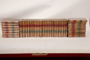 VOLTAIRE Œuvres complètes. 65 vol. in-8 reliés 1/2 veau, dos lisses ornés, pièces de titre de maroquin bordeaux & vert, tranches jaunes. Paris Esneaux 1823. Planches dépliantes et figures in-texte. Très bel ensemble.