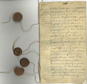 AVESNES. Manuscrit d’un mémoire devant la Cour féodale d’Avesnes, 17 août 1733 ; cahier de 10 pages petit in-fol. sur parchemin, 4 sceaux pendants de cire brune.