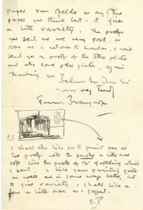 Il le remercie pour l’envoi des gravures de la planche, qu’il trouve très bonnes, et dont il lui a renvoyé les épreuves, à envoyer avec les autres gravures à son adresse à Londres. Il le prie d’exécuter d’autres épreuves sur le même modèle, et ajoute, illustrant son propos d’un petit croquis montrant une maison d’où s’échappe de la fumée : il aimerait aussi qu’on imprime une ou deux épreuves avec la fumée, car il aime avoir de la variété dans les tirages…