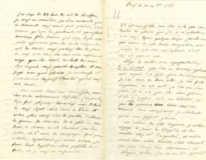 Paris 10 décembre 1781. Jolie lettre sur les occupations qui remplissent sa vie, notamment au théâtre, où il a été obligé de veiller aux représentations de sa pièce Le Baiser, où il a dû faire des changements, et qu’il a fait imprimer… « Au milieu de cette bagarre je m’étais engagé à jouer la tragédie et la comédie chez Mr d’ARGENTAL ; et enfin avant hier notre théatre s’est r’ouvert. J’ai joué Varus dans Mariamne, et Arlequin Hulla ; j’ai eu un très grand succès […] Je suis encore accablé de travail pour nos premières représentations. On joue à Noël Mariamne, encore, où je joue Varus, Les deux génies comédie de Mr le Comte de SEGUR, où il a voulu que je fisse le premier rôle ; le lendemain nous donnons Zaïre [de VOLTAIRE] où je joue Orosmane et Jeannot et Colin où je joue Colin. Voilà ma vie qui a l’air dissipée, et qui dans le fait, est très laborieuse »… Des ouvriers travaillent à l’appartement qu’il doit habiter à l’hôtel de Toulouse ; il espère qu’au 1er janvier le duc de PENTHIEVRE le mettra sur l’état de sa maison et lui donnera des appointements, etc.