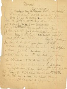 Texte avec ratures et corrections sur le « mariage anti-chrétien ». Il se souvient d’un ami châtelain qui lui parlait de son château , envahi d’humidité… « Une jeune fille était à l’intérieur avec une fleur aux cheveux : elle téléphonait à Paris pour avoir un mariage entre Chrétiens ou non. Et moi aussi qui m’ennuyais je téléphonai avec ce qui me tomba sous la main, un bout de caoutchouc […]. Je fis l’éloge de l’éducation universitaire, une belle voix de basse me répondit “mariage anti-chrétien” Je demandai la signification de ces mots »….