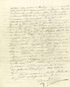 « Mon ami ta lettre me touche jusqu’aux larmes. [...] Mais le sacrifice est fait, j’ai eu quelques jours d’un violent chagrin, il a même été si fort que je n’ai trouvé d’autre ressource que de faire une centaine de lieues. Heureusement j’avais en les faisant un service à rendre. J’ai passé sur la place publique d’Orléans une nuit de 1 h. à 4, dont je me souviendrai longtems. Le résultat est que il ne faut jamais entrer dans une famille où l’on ne vous adopte pas avec plaisir. La fierté est malheureusement devenue une habitude si forte chez moi, que je ne pourrais pas répondre de ne pas envoyer faire f. tous les parens même le plus puissant, pour peu qu’ils prétendissent sortir de la parfaite égalité. Cela mettrait cette aimable fille dans une position très embarassante. D’ailleurs je n’ai pas le sou et il [y] a quelque différence à être la femme d’un Receveur gal ou d’un pauvre diable d’audr à 500 fr. par an. Autre comparaison qui ferait mon malheur pour peu que je soupçonnasse ma femme de la faire. Je te dirai entre nous que je refusai il y a deux ans une fortune très considérable, et une femme si aimable que je lui ai fait la cour depuis, le tout pour éviter cette comparaison. J’en ai été aimé, c’est un coeur excellent et cependant si le refus était à faire, et qu’elle put n’avoir jamais été mariée je ne la demanderais pas plus qu’autrefois. Voilà, mon bien cher ami, mon âme tout entière. Ne dis donc rien à ... qui puisse lui taire soupçonner un projet que j’en ai arraché pour toujours ».