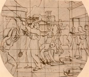 École française du XIXe siècle Scène de construction Plume et encre brune. Mise au carreau. …