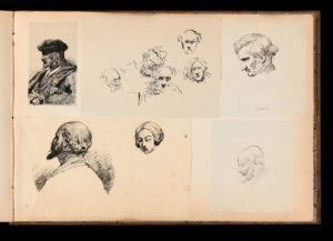Album comprenant des portraits d’artistes et personnalités dont Meissonnier, David d’Angers, Delacroix, Géricault, Le Prince, Napoléon, autoportrait, H. Vernet, réalisés en partie pendant les séances de l’Institut.