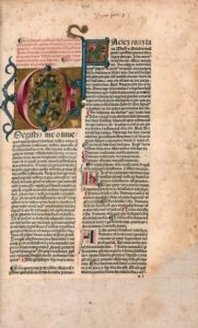 Une grande initiale peinte à décor floral sur fond doré en tête de la première colonne de texte (64 x 57 mm), une petite, également ornée d’un décor semblable, en tête de