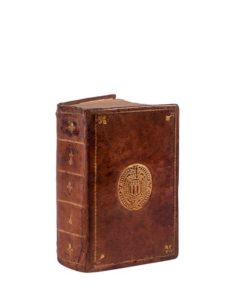 plats, fleur de lys et hermine aux angles, armoiries dorées au centre, dos lisse orné de lys et d’hermines alternées, tranches dorées (reliure bretonne de l’époque).